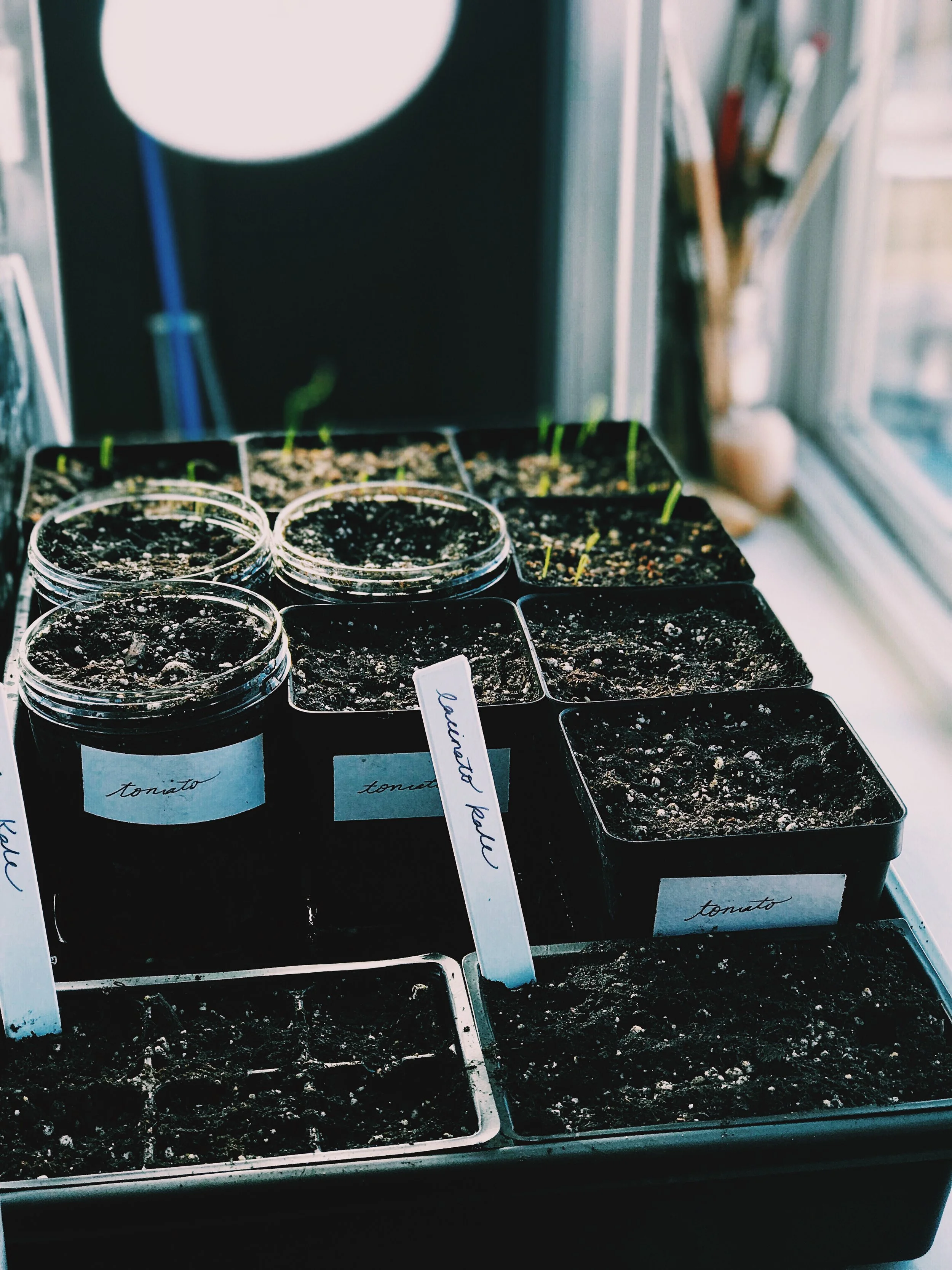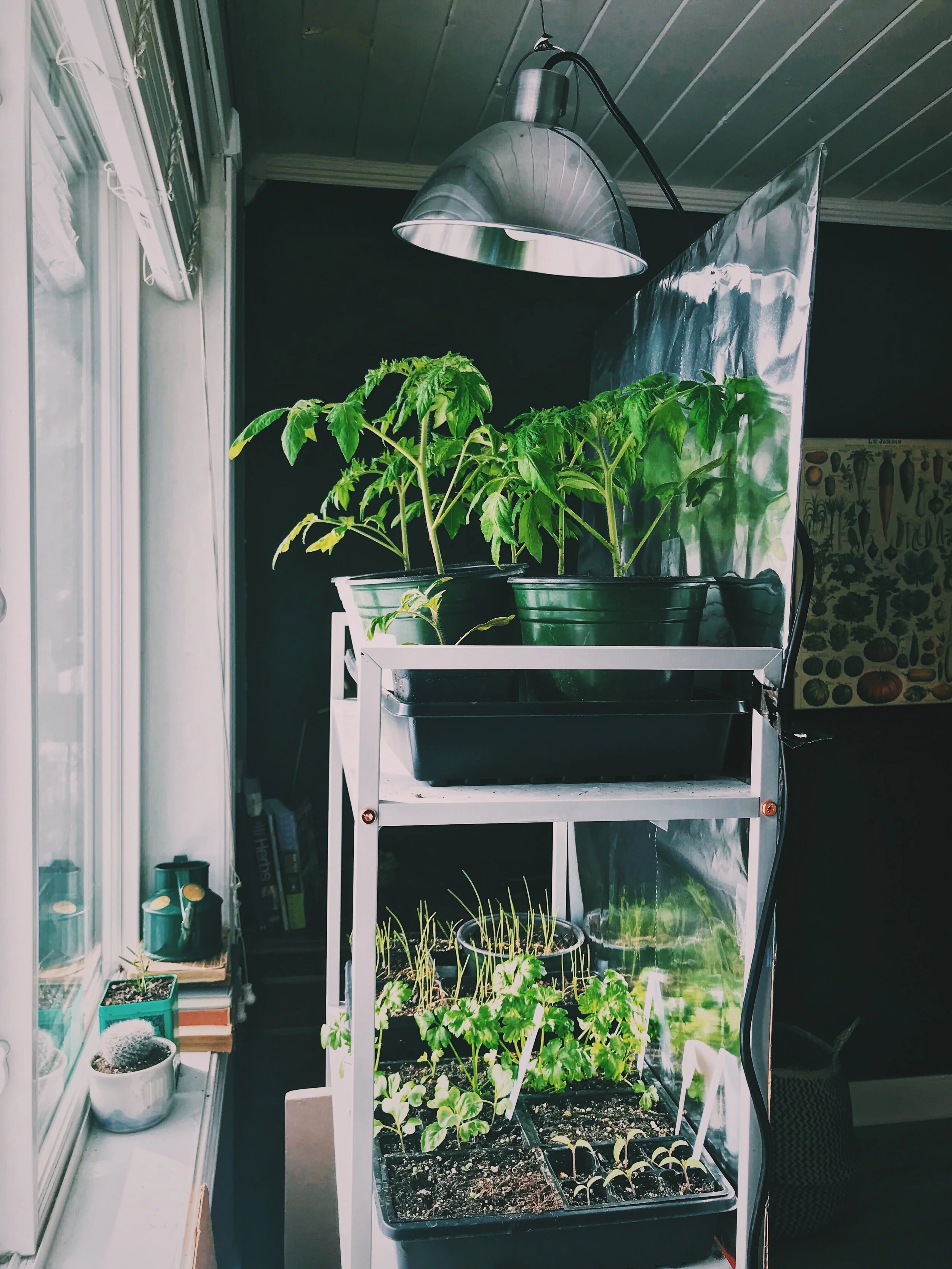 Over the last few years I have played with my seed starting set up. There is so much varying information out there about starting your own plants, and decided to be creative and form my own approach. This approach works well for the space I have, and to be totally transparent I am still very much learning and figuring it out as I go. I adjust the set up based on what my plants need (more light, more space, etc.) throughout the winter and spring until they are ready to be planted. It's flexible and fluid, but I have found it to be successful!