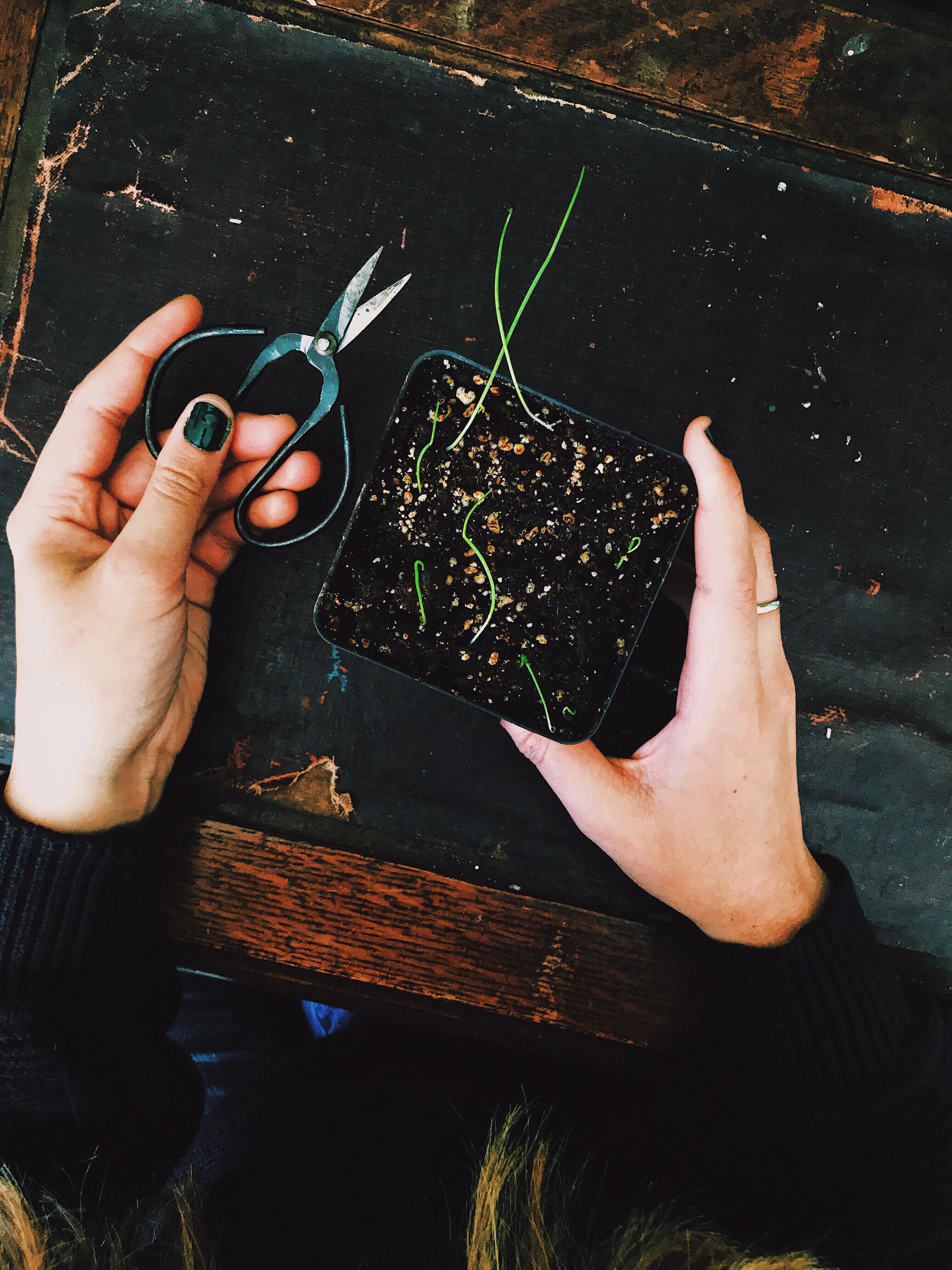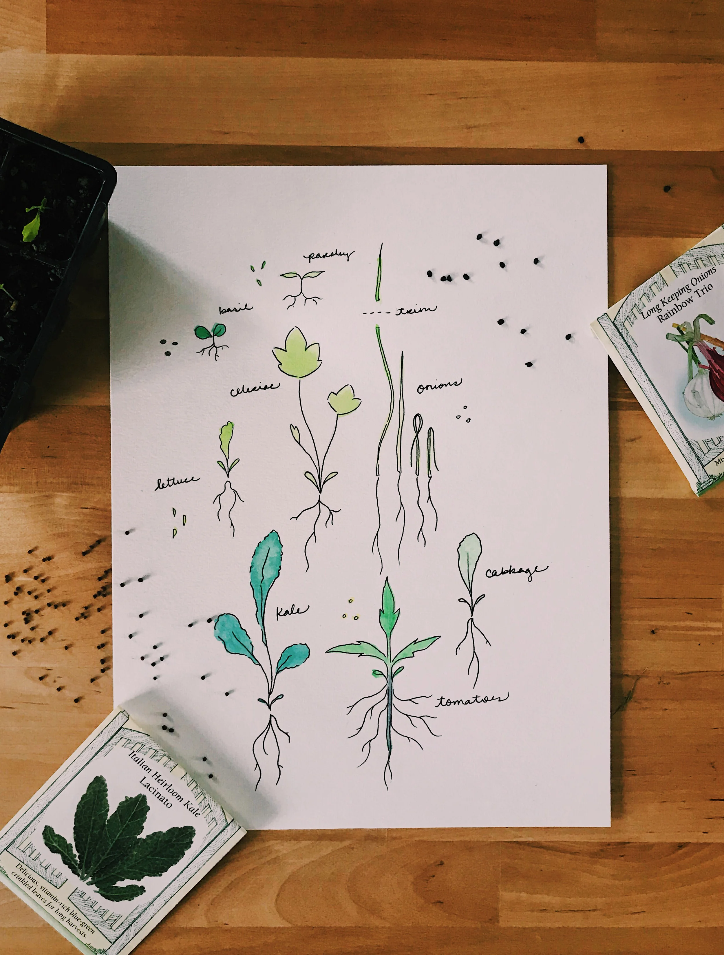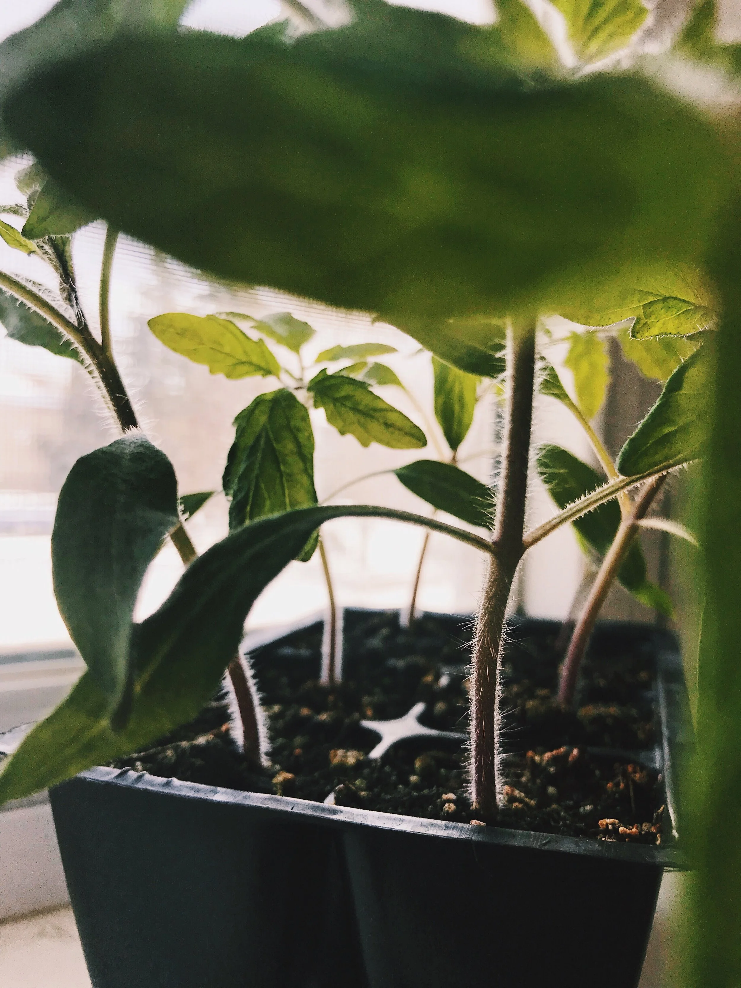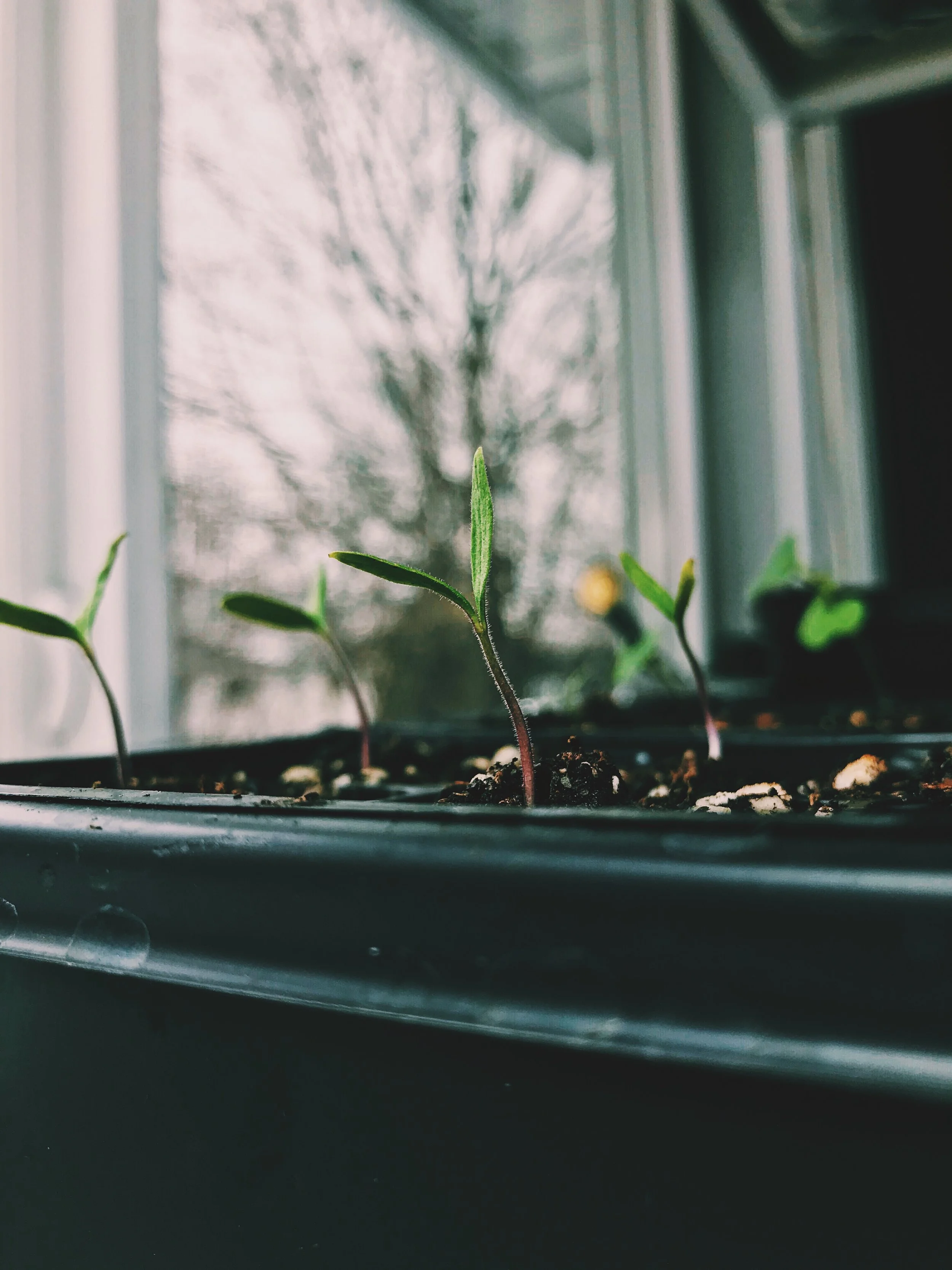 Most seeds just require good soil, sunlight, and water to form good starters, but onions and tomatoes require a little extra care. For onions, I found the Encyclopedia Botanica Podcast Episode on Starting Onions from Seed to be super helpful! Onion seeds should be started early, between January and February, and benefit from a little trimming. Once your onion starts are 3-4 inches tall, cut them to 1-2” tall. Repeat this trimming until they are ready to plant. This trimming increases the hardiness of the onion stem, keeping them standing when planted, and help promote strong bulb growth over tall leafy growth.