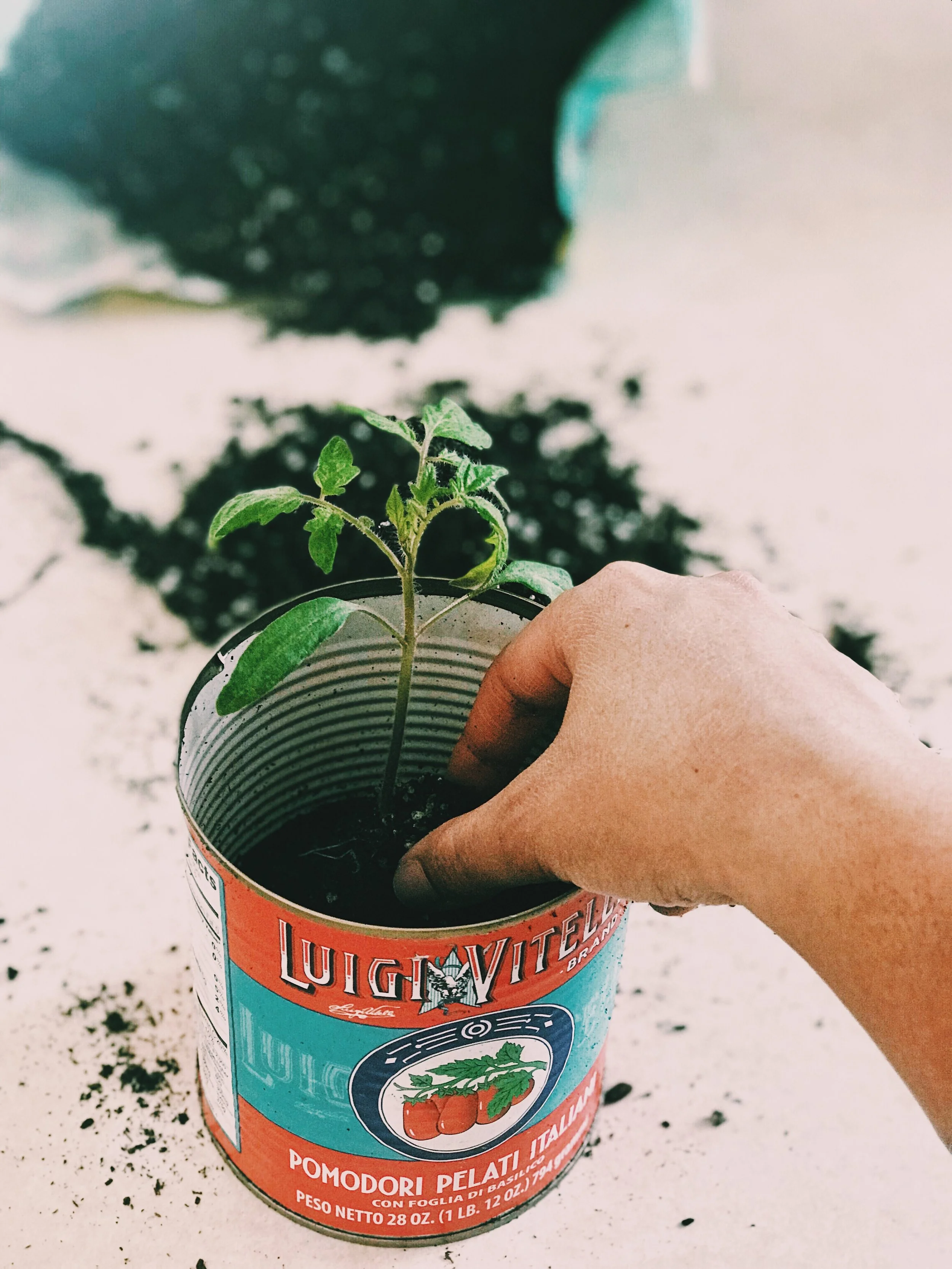 Tomatoes are unique in that their roots come out of the main stem. If you look at a tomato plant stem, there are often tiny bumps all along it. These bumps are actually root nodules, getting ready to sprout from the stem – crazy right? Start by planting your tomato seeds in a small 6 pack seed starting planters until 3-4” tall. Then transplant your tomatoes to 4” seedling pots, burying the stem up until the two base leaves - these are the two leaves that come out of the ground first. The stem now buried will produce roots, giving you a stronger, well-established tomato plant.